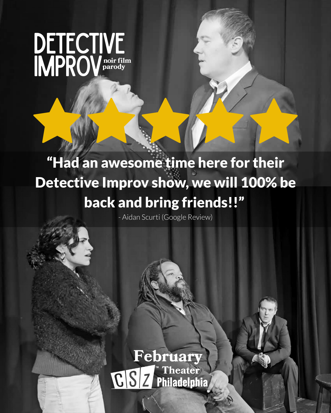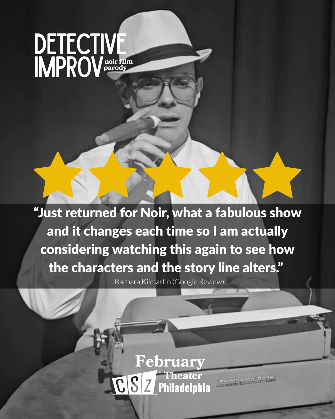 This February, CSz Philadelphia presents the return of their improvised film noir parody, Detective Improv. Director Jake Lucas shared some insights into the development of this comedy-mystery show. They say, “I've always loved noir movies; I grew up on the history channel, Disney VHS, and I Love Lucy reruns. I wanted to push the boundaries of improv to see how cinematic we could make it feel for an audience, "zooming in" for a dramatic close up. I'm very proud of being able to take the best of the genre and translate it to the stage.”