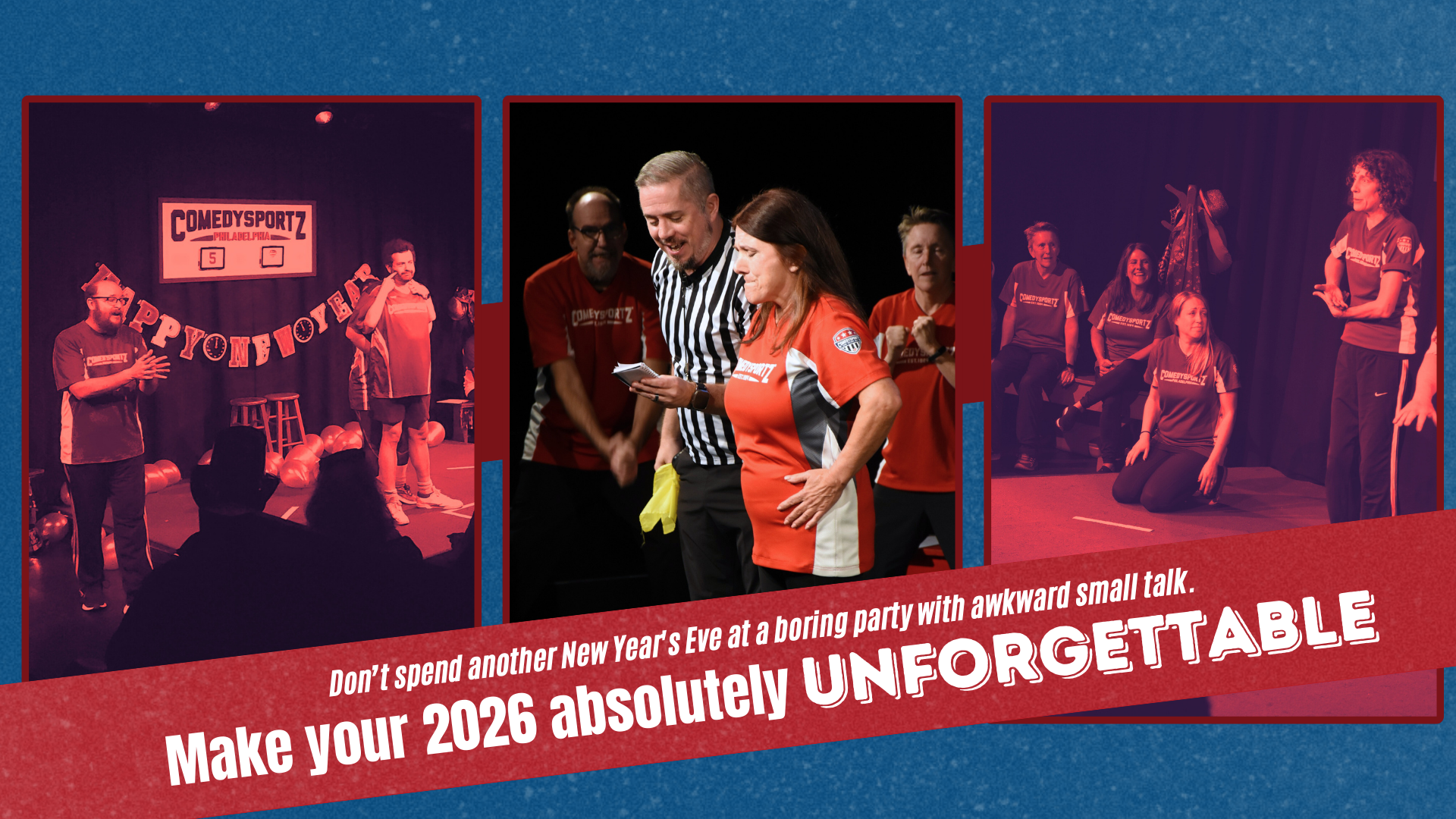Say buh-bye to the predictable and hello to a night of uproarious fun with ComedySportz New Year’s Improvin’ Eve!