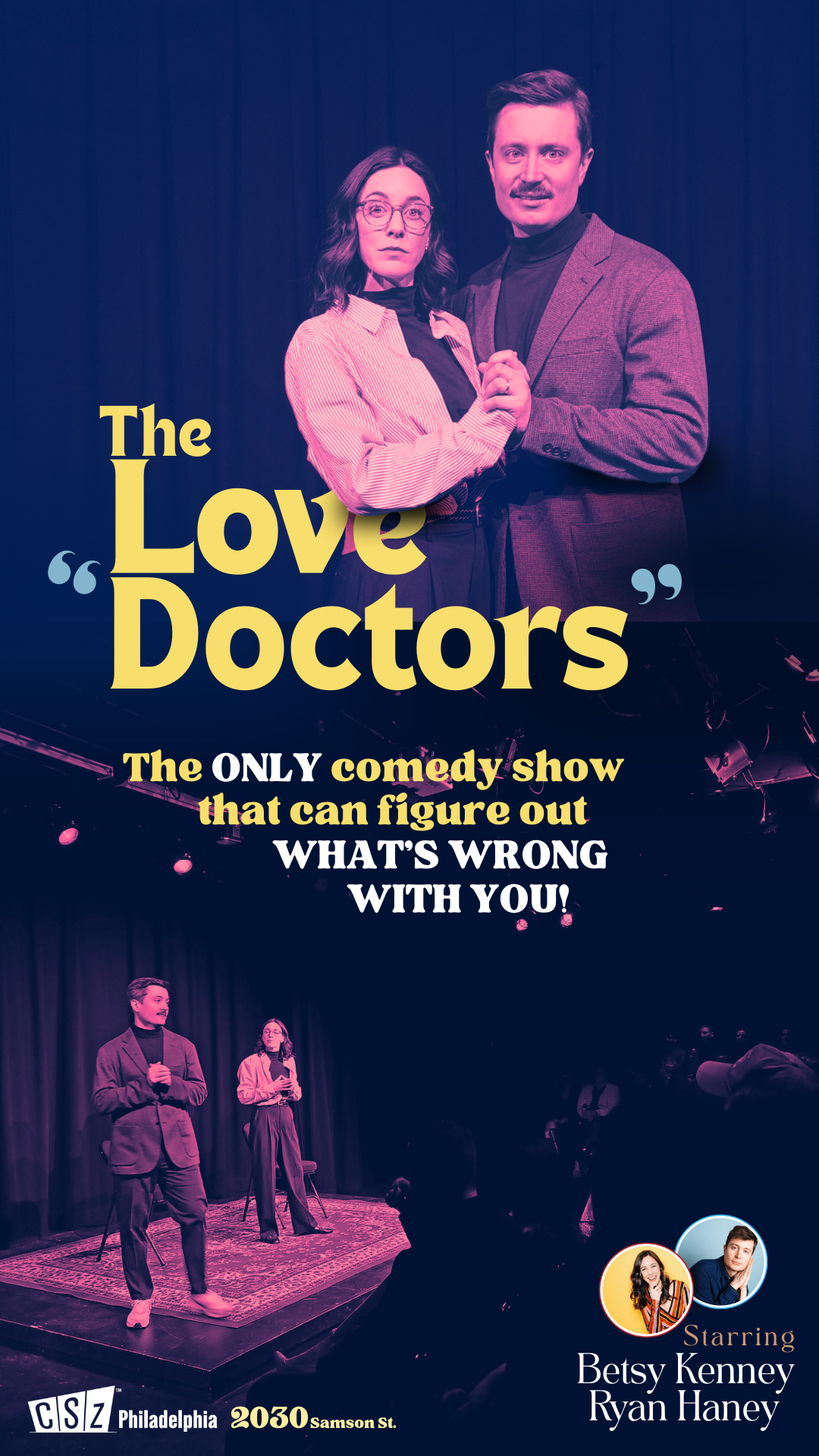 Unlicensed psychologists and “World’s Greatest Married Couple” Betsy Kenney and Ryan Haney have pioneered a powerful new performance-based therapy that will give lucky members of the audience a stunningly clear picture of why they suck at love and what they can completely change about themselves to fix it. (Note: Actual solutions not guaranteed.)