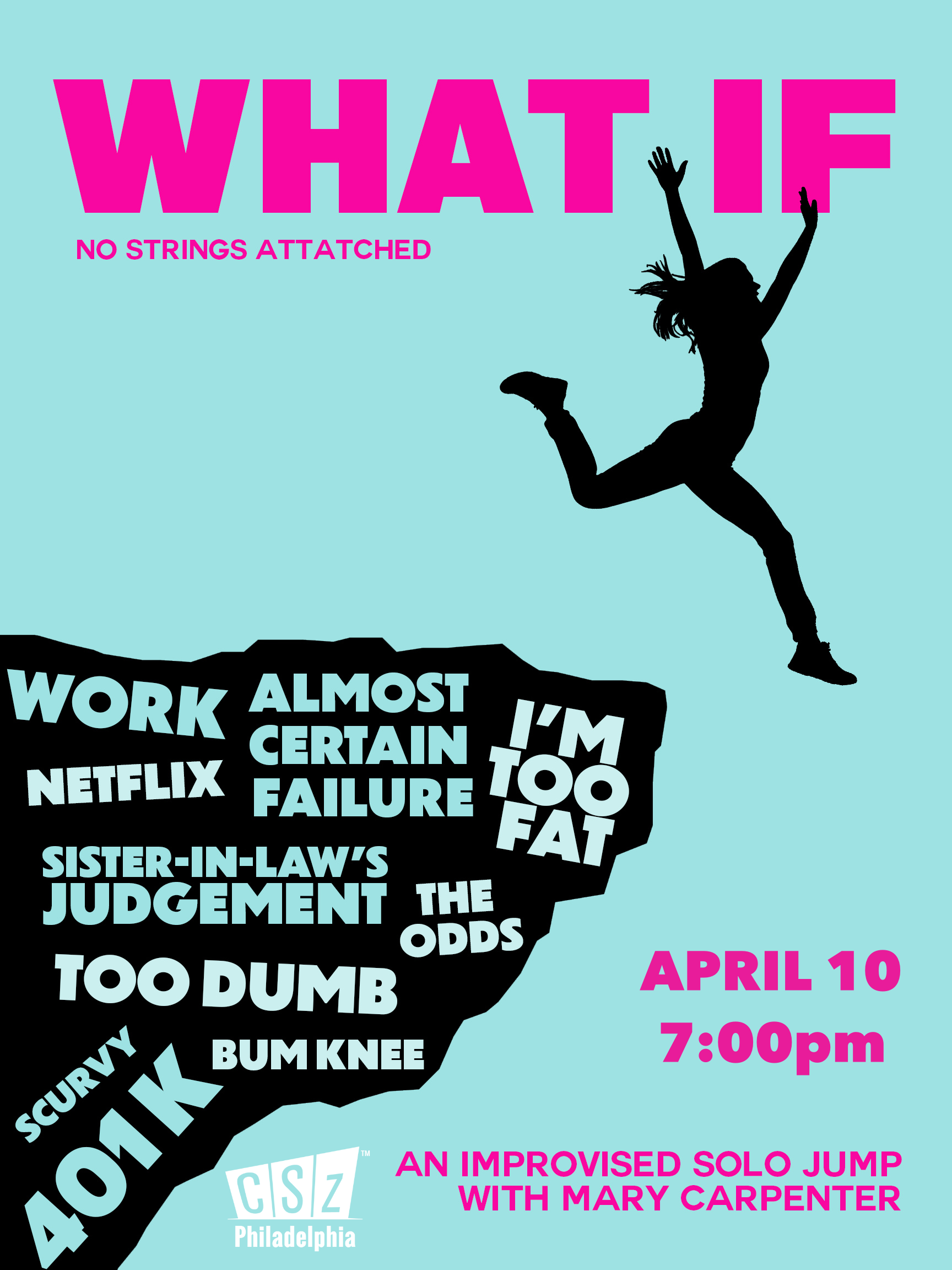 Buying the bar a round of drinks? Skydiving? Living in another country for a year? What If is a solo improv show about the dreams we wait to chase and the obstacles that get in the way. With the audience joining in as the good and bad voices in our heads, Mary Carpenter (ComedySportz, It Doesn’t Matter, Improvised Star Wars,) hilariously celebrates the flaws, fabulosity and funniness that we all have inside of us.